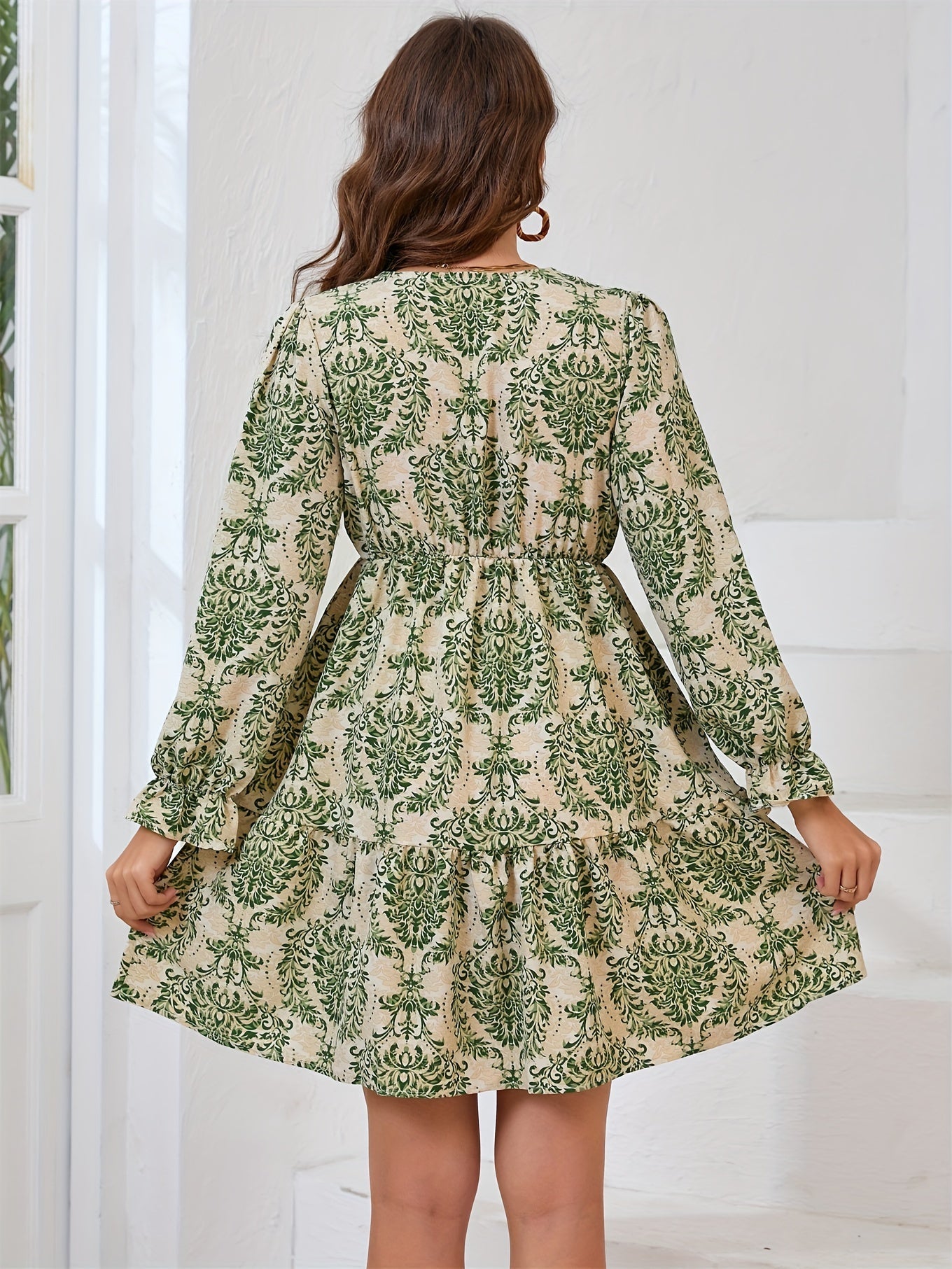 Details: bohemian print, ruches en gelaagde zoom